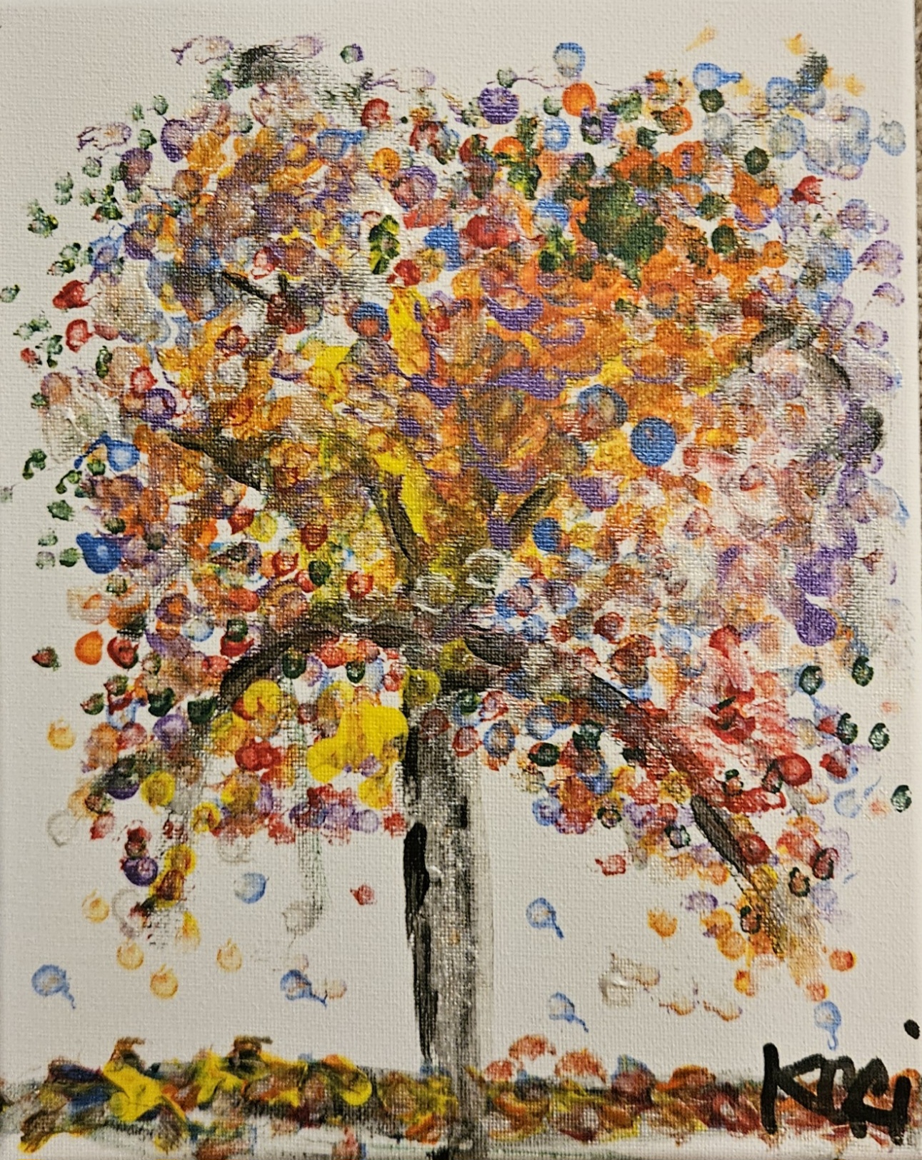 This vibrant art print features a tree full of fall colors - oranges, reds, and emotion. Originally painted in acrylics on stretched canvas using pointillism by Kofi