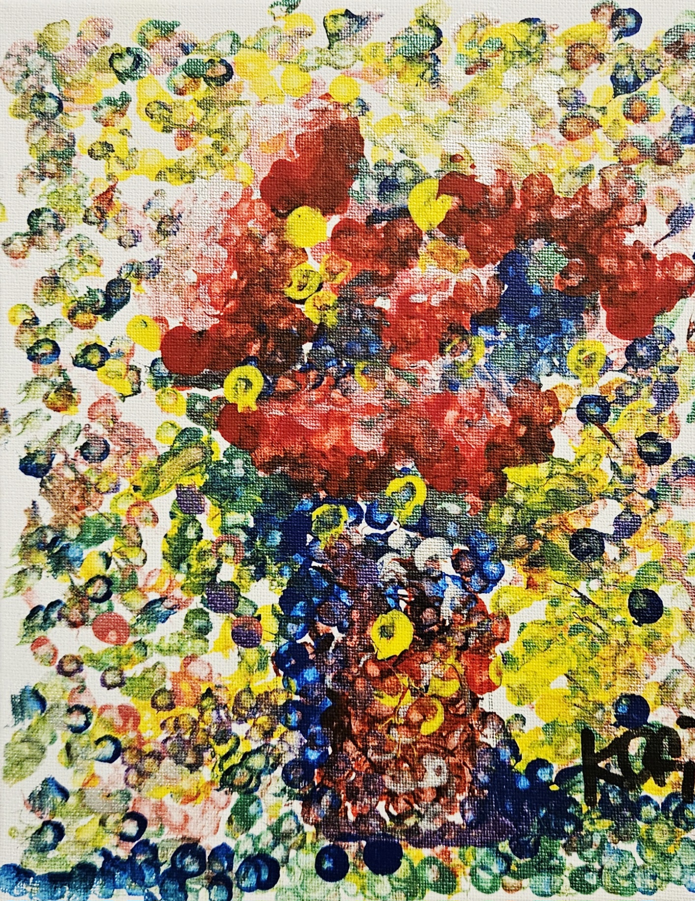 This vibrant art print features red flowers with a colorful background. Originally painted in acrylics using pointillism by Kofi.